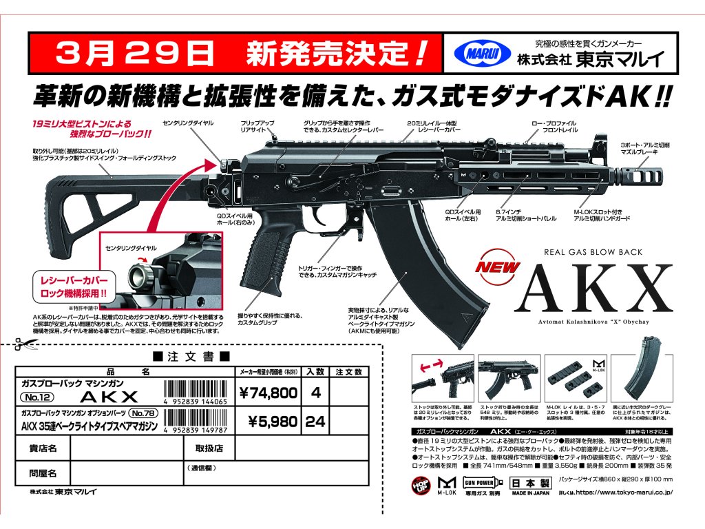 ✅ Tokyo Marui AKX GBBR představuje nejnovější a technologicky nejpokročilejší plynovou útočnou pušku z dílny legendárního výrobce Tokyo Marui. Nabízí extrémně silný blowback s 19mm pístem, moderní hliníkové M-LOKpředpažbí, precizní horní RIS lištu se zamykacím mechanismem a perfektně realistický chod závěru i ovládacích prvků.