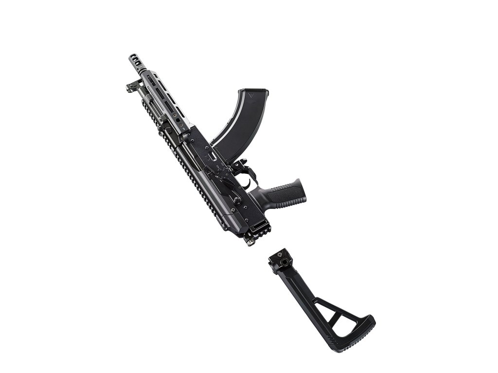 Unikátní zamykací mechanismus horní RIS lišty zajišťuje absolutní stabilitu optiky i při prudkém blowbacku — zásadní výhoda, která řeší dlouhodobý problém všech AK platforem. Zadní mířidlo lze jednoduše sklopit.