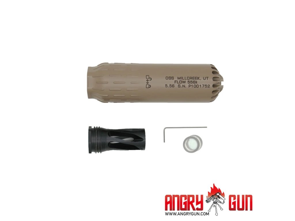 Tlumič Angry Gun FLOW 556K je inspirován reálným systémem OSS FLOW, který využívá 3D tisk pro optimalizaci proudění plynů a snížení zpětného rázu. Airsoftová verze zachovává stejný design, ražení i materiálové vlastnosti. Je vyrobena z nerezové oceli metodou 3D tisku (DMLS), díky čemuž je každý kus přesně strukturován a extrémně odolný. Povrchová úprava Cerakote FDE zajišťuje dlouhou životnost a realistický vzhled.