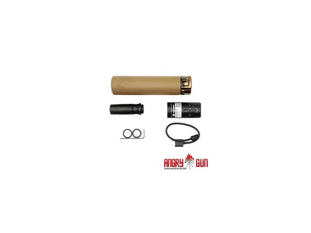 ✅ Angry Gun nasvětlovací tlumič QD SOCOM556 v pískovém provedení (FDE) kombinuje realistické hluboké ražení, odolné tělo z leteckého hliníku 6061 a rychloupínací QD systém. Integrovaný modul Acetech AT2000R nasvěcuje červené i zelené Tracer BBs až do 30 BB/s a dobíjí se přes USB-C.