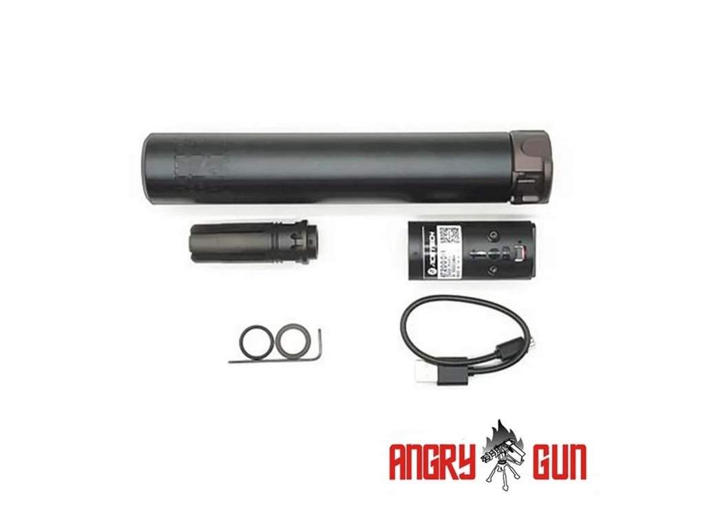 Angry Gun QD SOCOM762 je vysoce kvalitní airsoftový nasvětlovací tlumič s integrovaným modulem AT2000R od Acetech. Jeho tělo je vyrobeno z leteckého hliníku 6061-T6 s hlubokým ražením a povrchovou úpravou v černé barvě, zatímco upínací mechanizmus a drobné zámkové díly jsou z oceli pro maximální odolnost. Tlumič se upevňuje na dodávaný QD flash hider SOCOM4 s QPQ povrchovou úpravou, který se montuje na 14-mm levotočivý (CCW) závit. Nasvětlovací jednotka umožňuje osvětlování zelených i červených tracer kuliček až do frekvence 30 BB/s a napájí se pomocí dobíjecích Li-ion baterií 10440 (nejsou součástí). Nabíjení probíhá přes Micro USB konektor a jednotku lze snadno vyjmout. Konstrukce zároveň umožňuje použití tlumiče k zakrytí delší vnitřní hlavně zbraně.