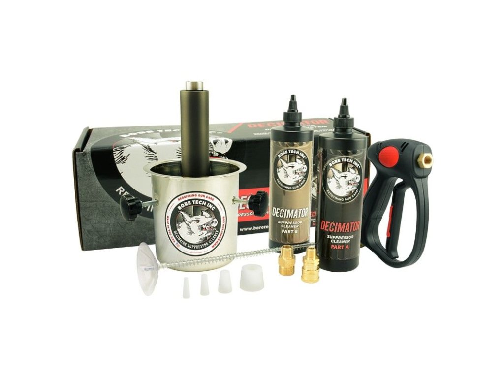 BoreTech Decimator přináší unikátní systém dvoufázového čištění, který efektivně odstraňuje veškeré usazeniny z tlumičů a úsťových brzd. Část A je určena na odolné nánosy karbonu a olova, zatímco část B se zaměřuje na měděné usazeniny. Sada obsahuje nerezový stojan s držáky, silikonové špunty pro různé ráže a tlakový spouštěč s ochranným štítem, který zajišťuje bezpečné odstranění uvolněných nečistot. Čistič lze použít jak na složené, tak na rozložené tlumiče a jeho účinnost je nejvyšší při použití s tlakovou myčkou o výkonu 1500–2500 psi (103–172 bar). Po několika cyklech dokáže z tlumiče odstranit i stovky gramů usazenin.
