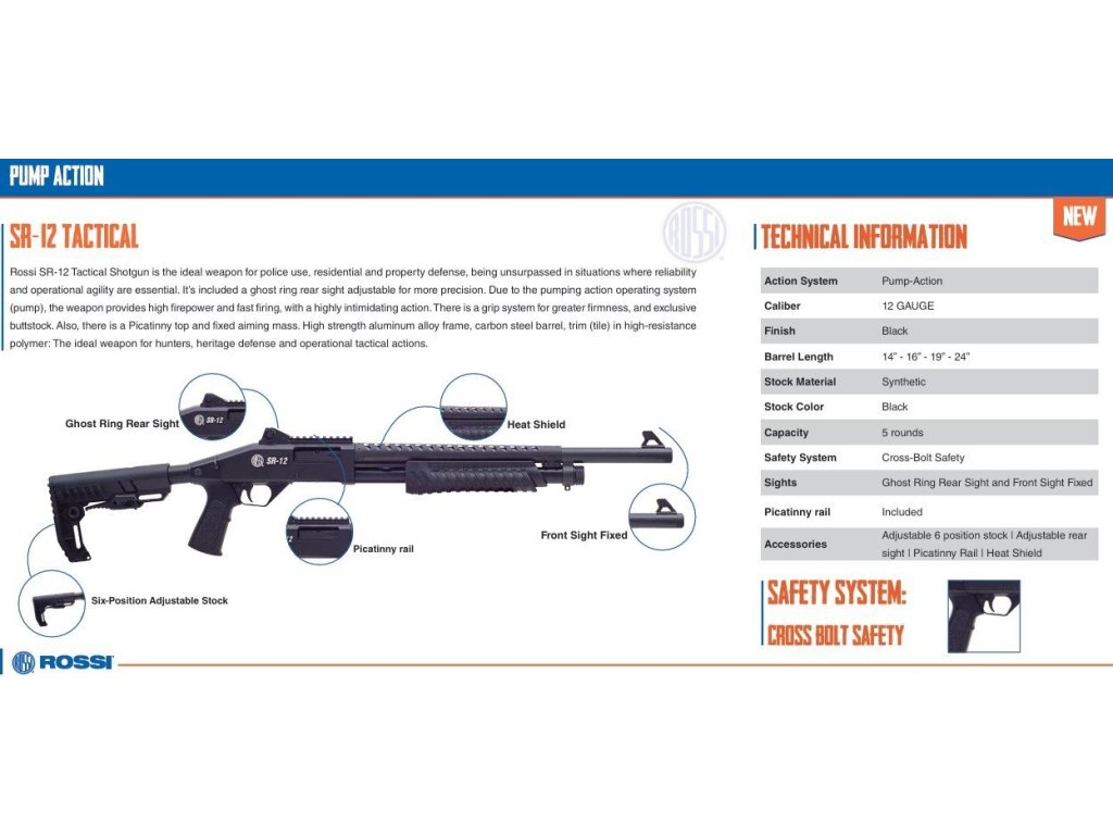 Společnost Rossi, založená v roce 1889, má více než stoletou tradici ve výrobě zbraní, které spojují spolehlivost, moderní design a dostupnost. Rossi SR-12 Tactical je navržena tak, aby splňovala požadavky na rychlou odezvu a vysokou palebnou sílu při obraně majetku, v operačních situacích nebo při loveckých scénářích.