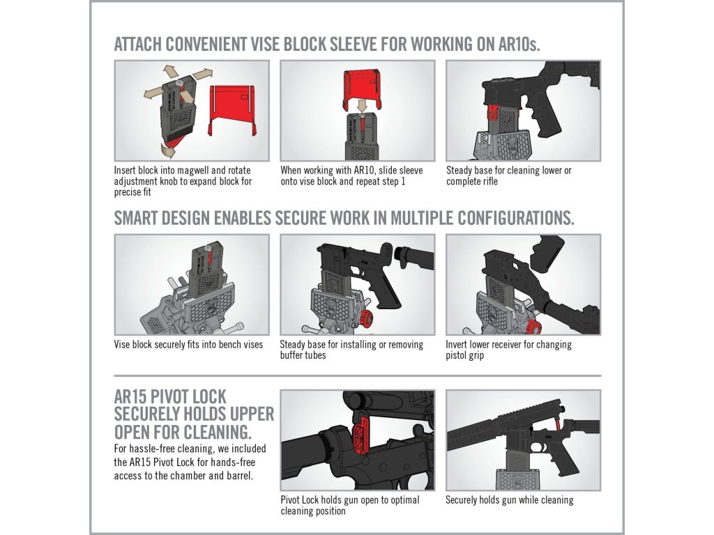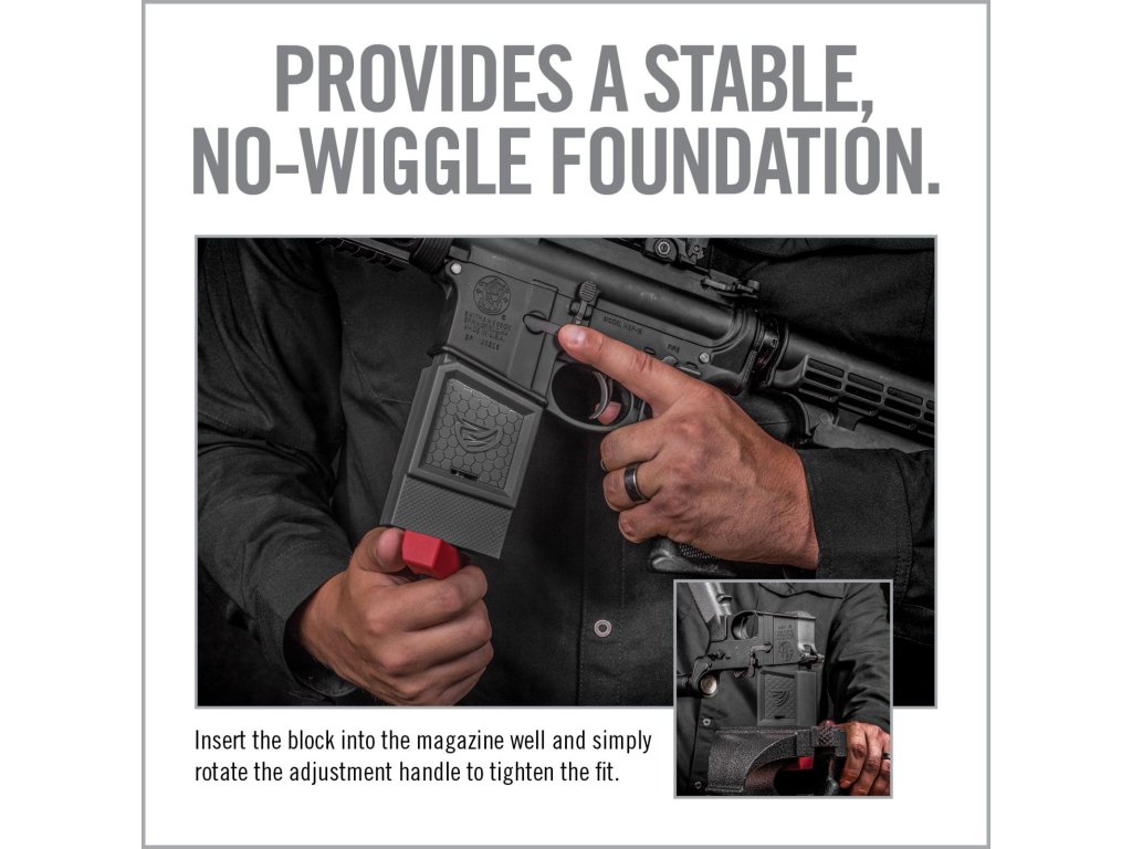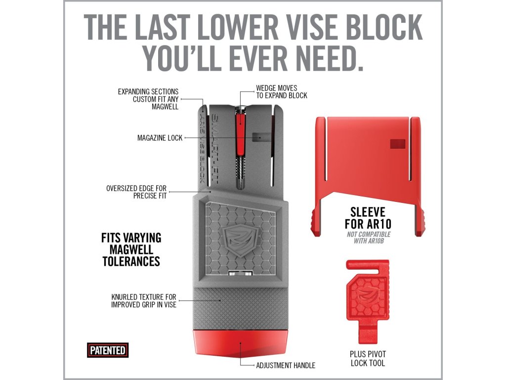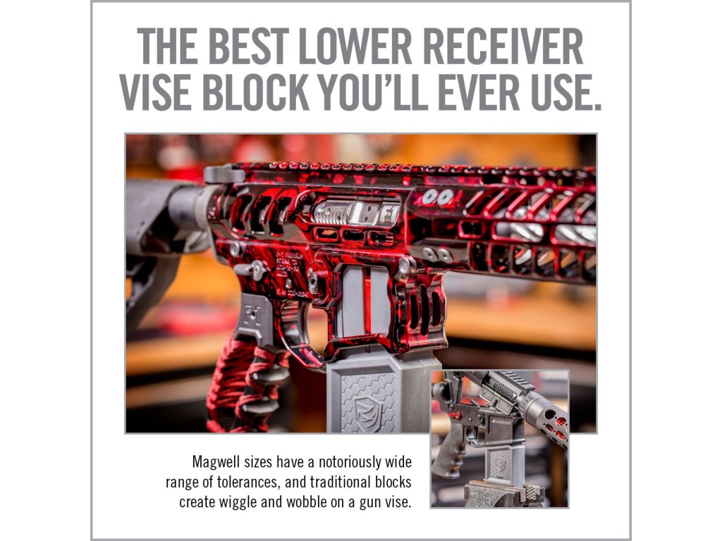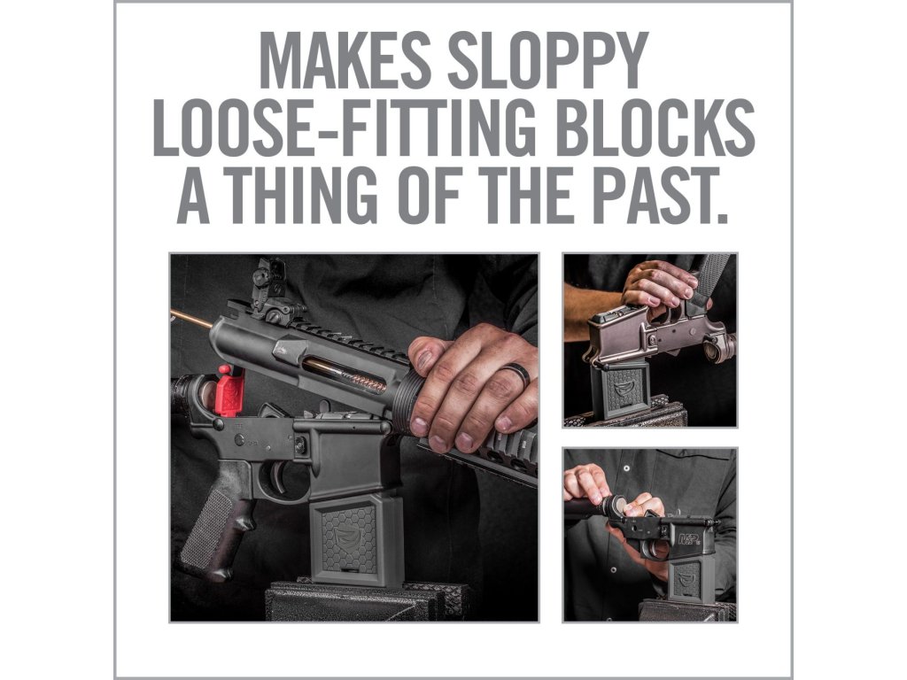 Držák Smart-Fit představuje revoluční „vise block“, který díky chytrému roztažitelnému systému přesně padne do zásobníkové šachty loweru pušek AR-15 i AR-10 (pomocí přiloženého nástavce). Stačí jen zatočit kličkou a držák se roztáhne – lower drží pevně a bez vůlí, což klasické bloky neumí. Umožňuje rychlé a bezpečné upnutí do svěráku a pohodlnou manipulaci s puškou při rozborkách, montážích, údržbě či čištění. Praktický Pivot Lock zajistí otevřený upper v přesné poloze. Ideální volba pro puškaře i domácí kutily.