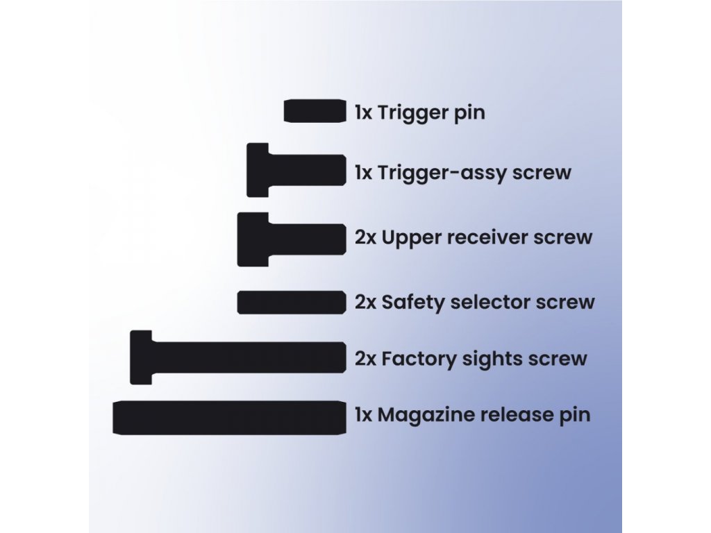 Všechny díly obsažené v sadě splňují normy výrobce a jsou speciálně vybrány tak, aby pasovaly do zbraně. Některé díly mají dokonce lepší vlastnosti a povrchovou úpravu než tovární díly.