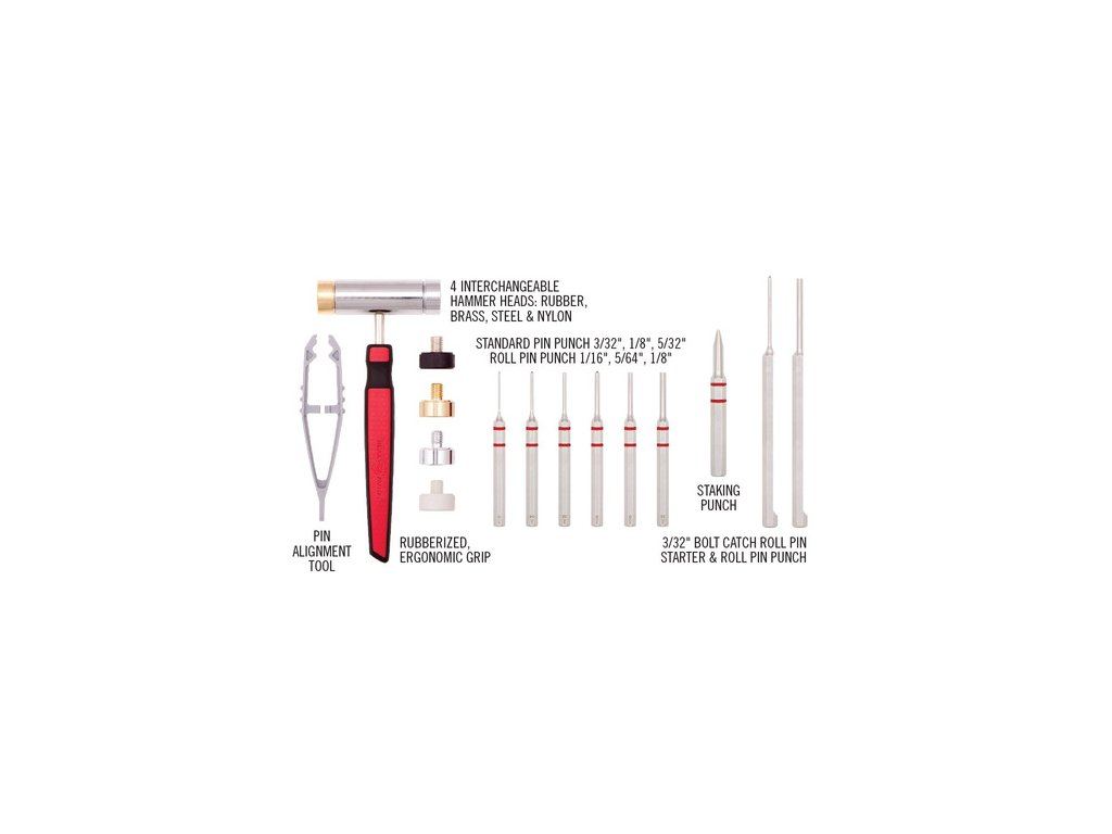 Tato sada byla navržena od základů právě pro potřeby práce se zbraněmi typu AR-15. Kladivo má čtyři vyměnitelné hlavice (gumovou, mosaznou, ocelovou a nylonovou), díky čemuž zvládnete vše od jemné montáže až po práci s tuhými čepy. Vyražeče z tvrzené, niklované oceli jsou přesně dimenzované a vybavené gumovými O-kroužky pro pohodlnou manipulaci a bezpečnost. Součástí je také speciální pinzeta pro přesné zavádění čepů, robustní pouzdro a všechny potřebné velikosti vyražečů pro AR-15 – duté i plné čepy včetně zavaděče.