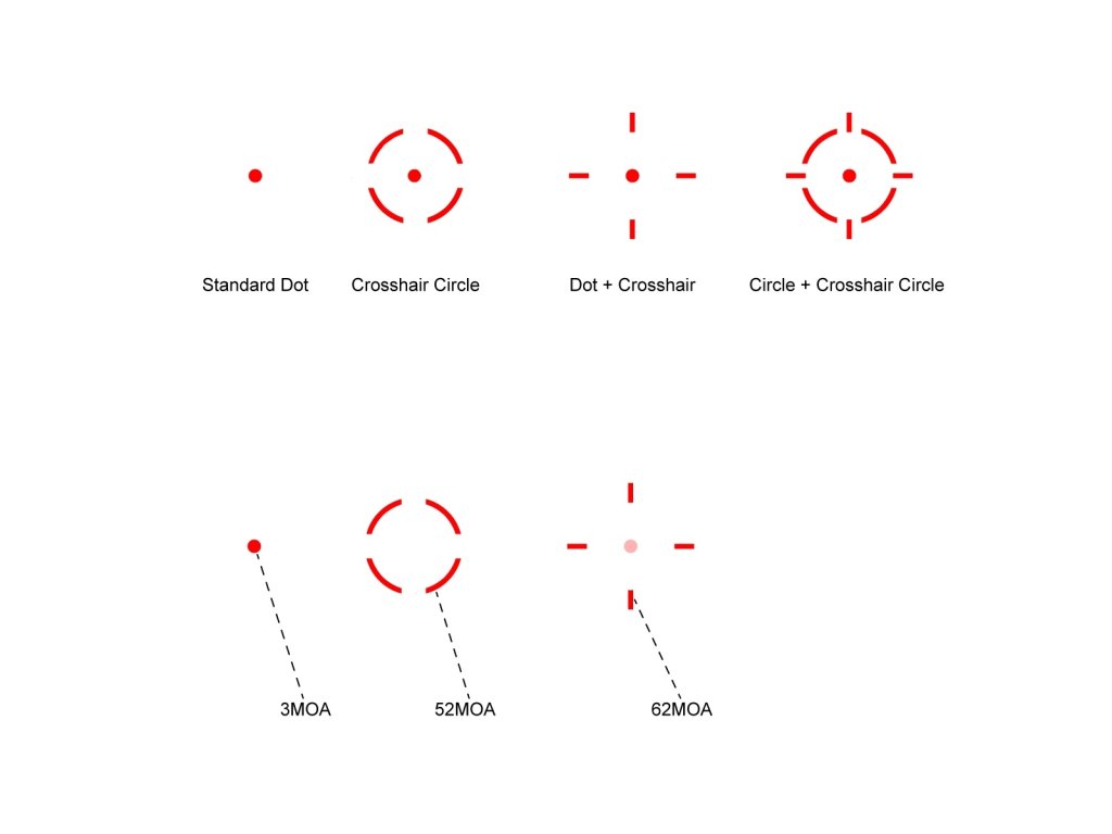 📌 Osnova: 3 MOA tečka, 52 MOA kruh, 62 MOA kříž (a jejich kombinace)