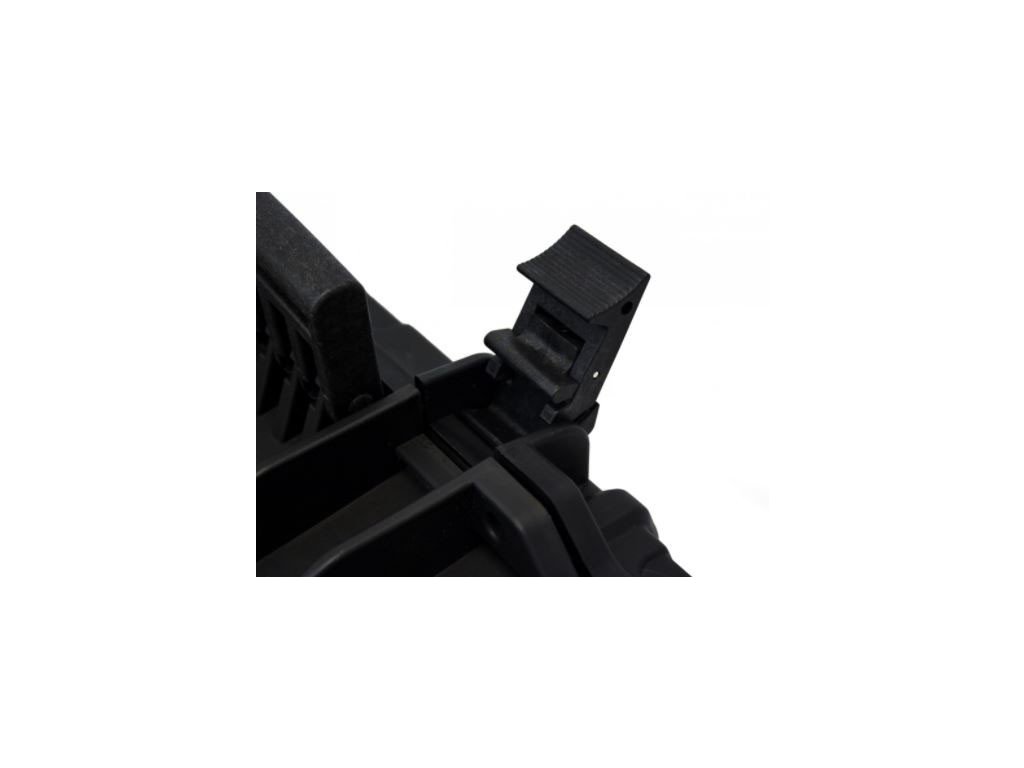 Interiér kufru tvoří pěnová vložka Pick and Pluck (PnP), kterou lze snadno přizpůsobit konkrétní zbrani a jejímu příslušenství. Kufr disponuje čtyřmi robustními zámky, možností použití visacích zámků a dekompresním ventilem Air Valve, který vyrovnává tlak – ideální i pro leteckou přepravu. Díky transportním kolečkům a teleskopické rukojeti je manipulace snadná i při plném zatížení.