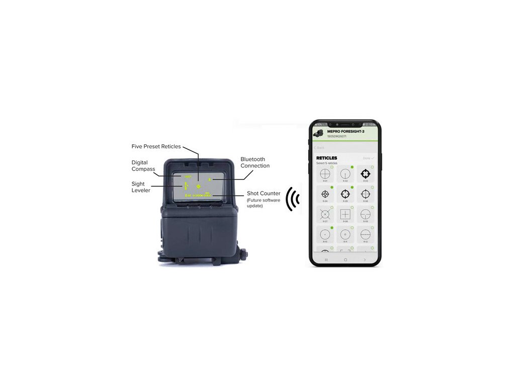 Foresight slouží jako samostatný špičkový kolimátor, jehož dobíjitelná baterie se napájí pomocí přiloženého USB-C kabelu. Mezi jeho funkce patří interní kompas, indikátor stavu baterie, pět přednastavených taktických záměrných křížů (které lze měnit / programovat podle preferencí uživatele) a integrovaný světelný senzor, který automaticky určuje jas záměrného kříže. Foresight je jedinečný také v tom, že po jeho spárování a aplikací přes Bluetooth si střelec může vybírat z databáze záměrných křížů a může kolimátor aktualizovat, jakmile jsou k dispozici nové funkce, jako je třeba funkce Shot Counter.