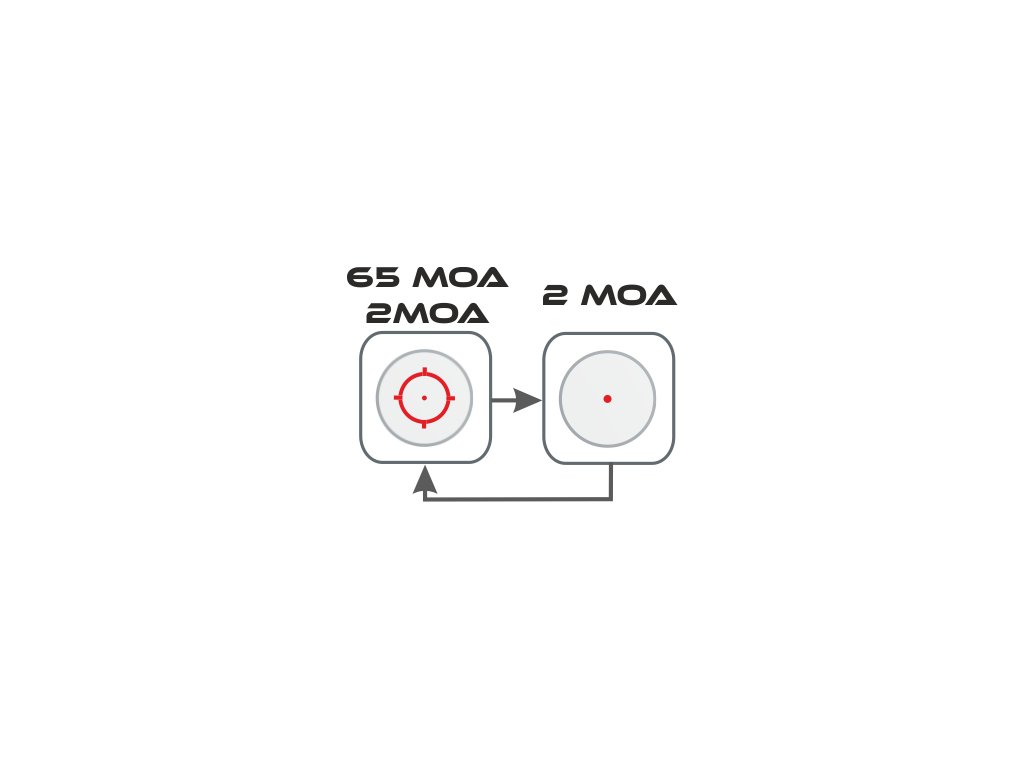 ✅ Přepínatelná osnovа: 2 MOA tečka nebo 65 MOA obrazec + 2 MOA tečka