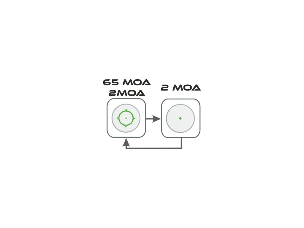 ✅ Přepínatelná osnova (2 MOA tečka, 65 MOA obrazec + 2 MOA tečka)