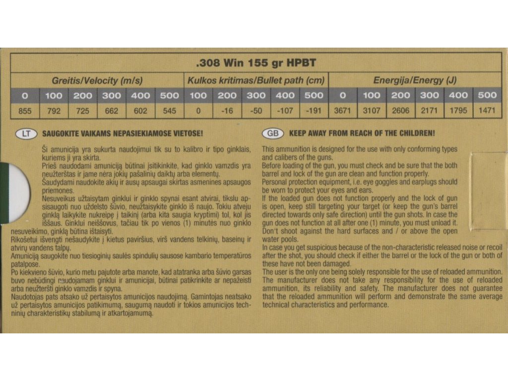 | Náboj .308 WIN - střela HPBT 155grn Sierra MatchKing Giraites Ginkluotes Gamykla (Litva) |