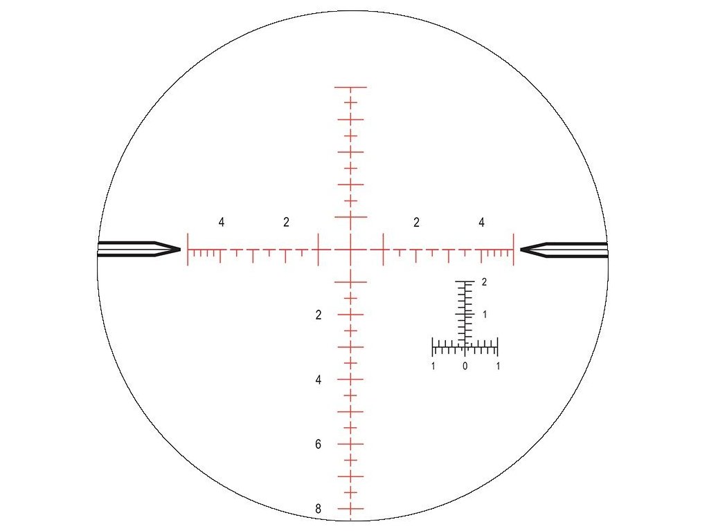 - Jednoduchý středový bod pro presné zaměření, odrážky po 0.2 MRAD na hlavních linkách pro snadnou výškovou a stranovou korekci