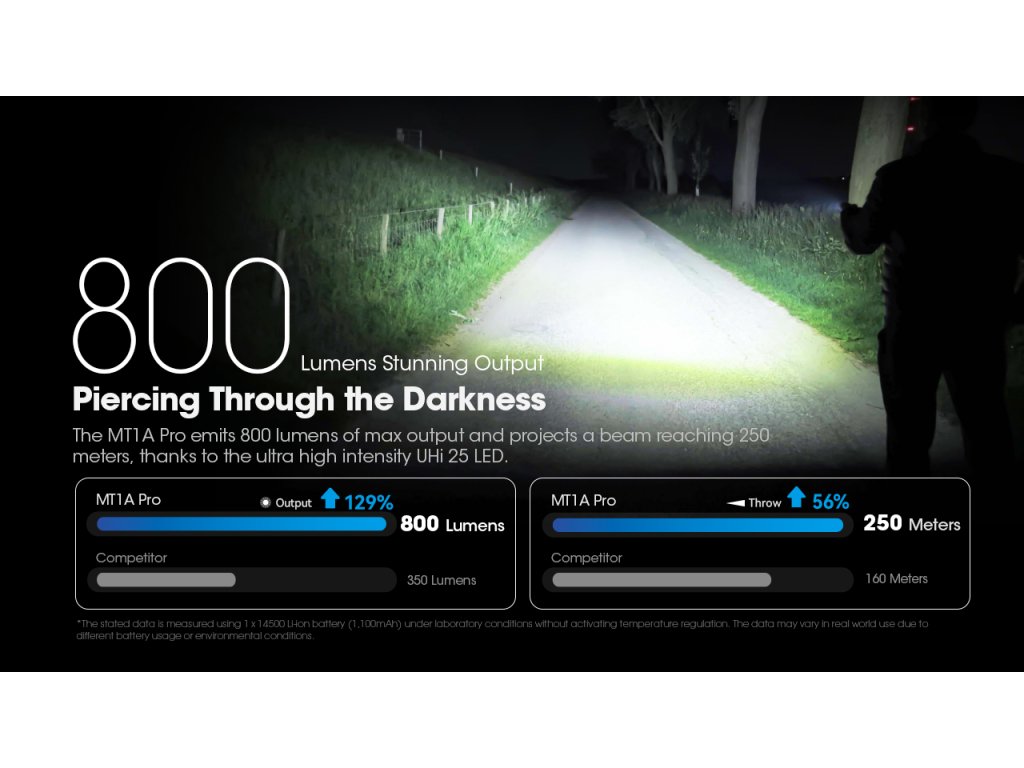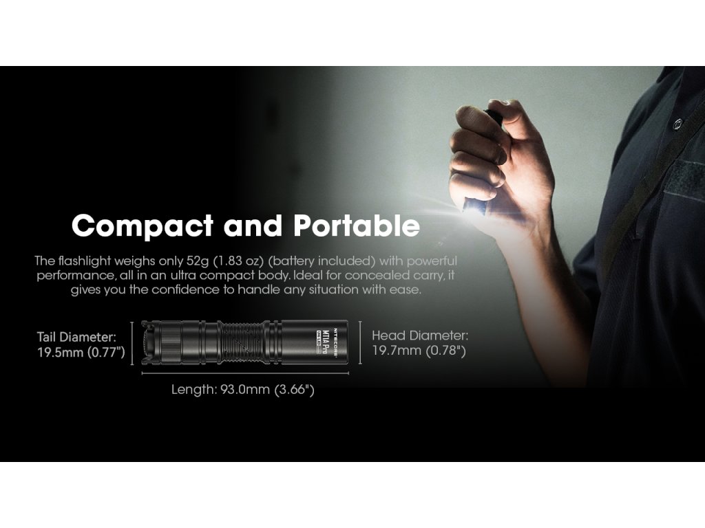 NITECORE MT1A Pro je malá, ale extrémně výkonná svítilna určená pro taktiku, outdoor a každodenní nošení (EDC). Používá pokročilou LED diodu NiteLab UHi 25, která poskytuje světelný tok až 800 lm a dosvit 250 metrů. Konstrukce z leteckého hliníku s tvrdým eloxováním HA III Military zaručuje vysokou odolnost vůči mechanickému poškození i extrémním podmínkám.