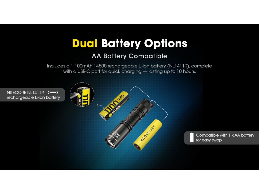 Systém napájení umožňuje použití buď nabíjecího Li-Ion akumulátoru (součástí balení), nebo standardní AA baterie. Uživatelé ocení taktický vypínač uzpůsobený pro použití v rukavicích a paměť naposledy nastaveného výkonu.