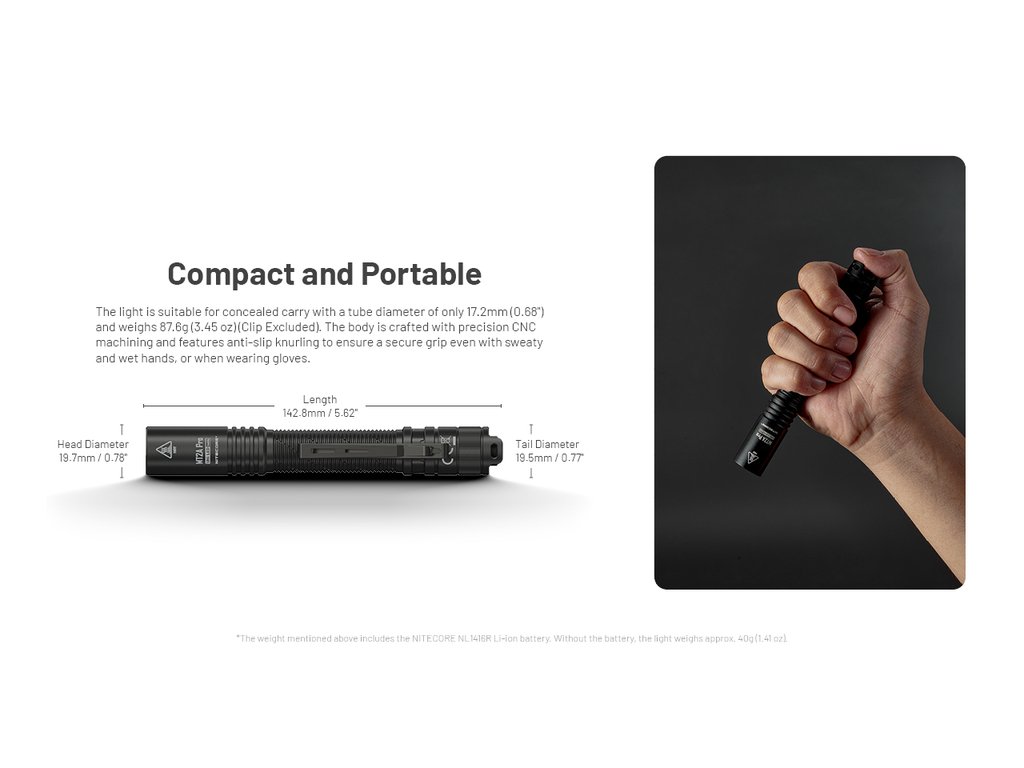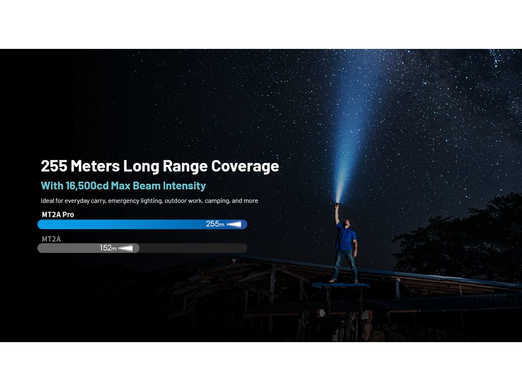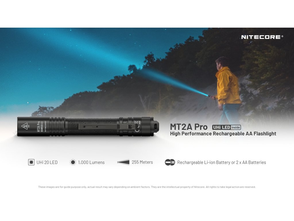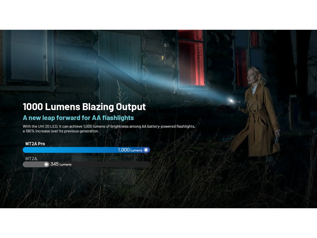 Taktická LED svítilna NITECORE MT2A Pro využívá moderní diodu NiteLab UHi 20, která generuje 1 000 lmsvětla s úzkým paprskem díky hluboké SMO parabole. Tělo je vyrobeno z leteckého hliníku s eloxováním HA III Military, což zajišťuje vysokou odolnost proti poškození.