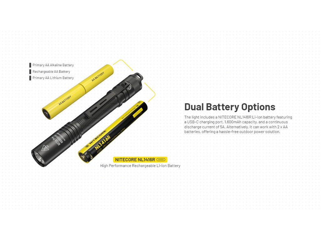 Svítilna podporuje dvě varianty napájení – nabíjecí Li-Ion akumulátor NL1416R (součástí balení) nebo 2× AA baterie. Vodotěsnost IP68 umožňuje ponoření do hloubky 2 m, přičemž nárazuvzdornost je 1 m.