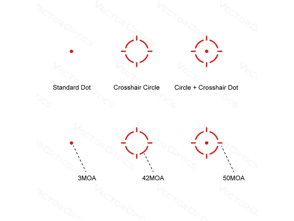 📌 Velikost záměrného bodu: 3 MOA tečka, 42 MOA kruh, 50 MOA kruh s tečkou