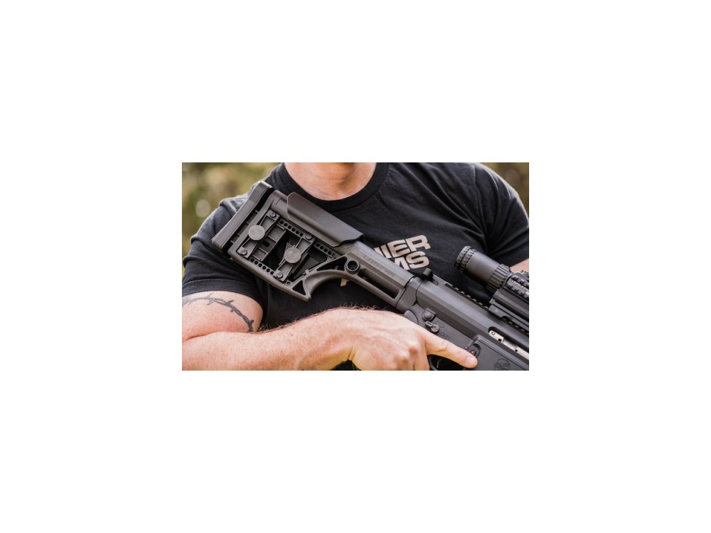 Pažba umožňuje zvýšení lícnice až o 0.98" / 25 mm a prodloužení zadní botky až o 1.06" / 27 mm. Nastavení lícnice probíhá ve dvou osách (nahoru/dolů a vpřed/vzad), což umožňuje precizní přizpůsobení optice i střelecké pozici. Konstrukce z vysoce pevného nylonu vyztuženého skelnými vlákny zajišťuje nízkou hmotnost pouhých 1.11 lb / 504 g při zachování vysoké strukturální odolnosti. Pažba je z výroby nastavena pro praváky, ale lze ji snadno upravit i pro leváky.