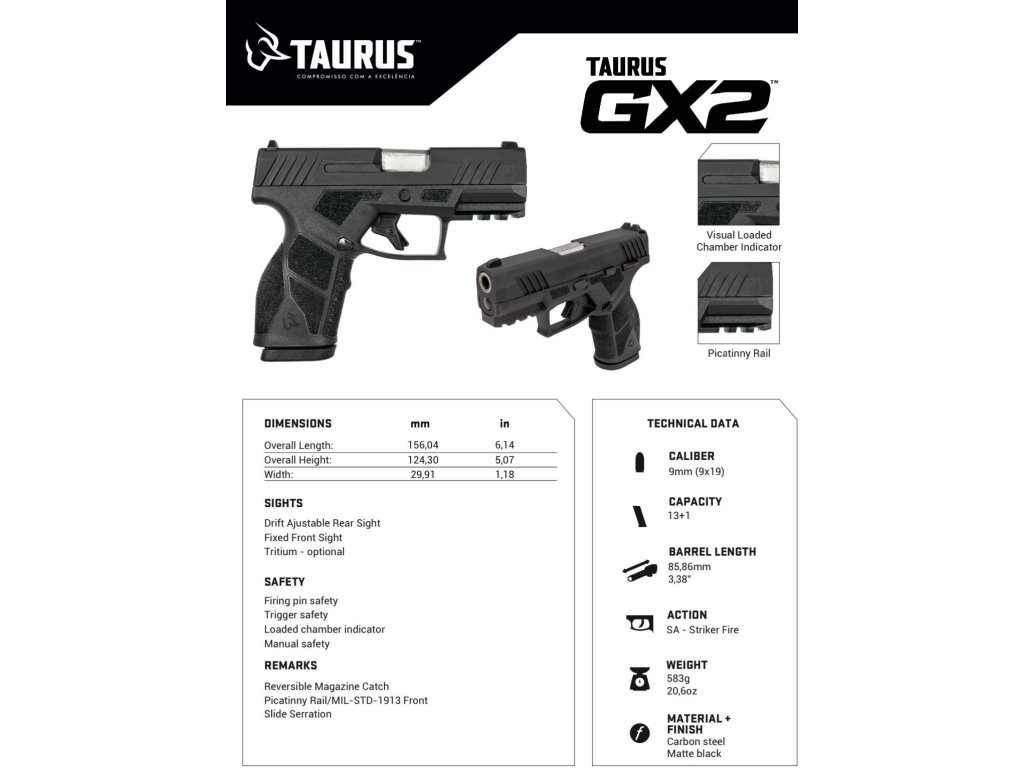 Pistole Taurus GX2 je novou subkompaktní zbraní, která přináší inovace v oblasti ergonomie, bezpečnosti a spolehlivosti. Díky svým rozměrům a lehké konstrukci je ideální pro skryté nošení a osobní obranu. Zbraň je vybavena oboustranným záchytem zásobníku, stavitelnými mířidly a indikátorem náboje v komoře. Manuální pojistka a pojistka spouště zajišťují maximální bezpečnost při manipulaci.