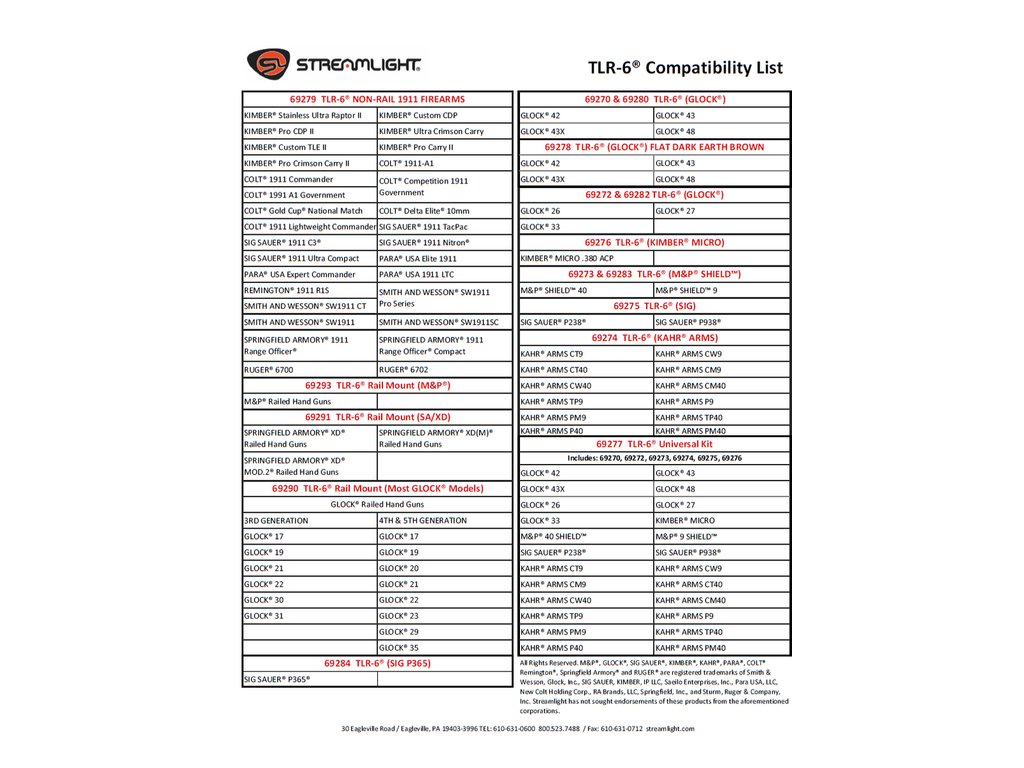 Model Streamlight TLR-6 využívá výkonnou C4 LED technologii, která produkuje 100 lumenů a intenzitu 2 000 candela. Optimalizovaná parabolická optika vytváří vyvážený světelný kužel kombinující dostatečný dosah a periferní osvětlení. Maximální dosvit činí 89 m.