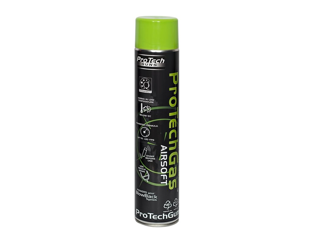ProTech Greengas je určen pro provoz v chladnějších podmínkách až do teploty 5 °C. Díky objemu 750 ml je vhodný pro intenzivní použití nebo pro delší akce, kde je potřeba mít dostatek plynu bez nutnosti časté výměny lahví. Je vybaven standardní tryskou pro kompatibilitu s většinou zásobníků plynových airsoftových zbraní. Robustní kovová nádoba je opatřena bezpečnostními prvky a varováními pro bezpečné použití.