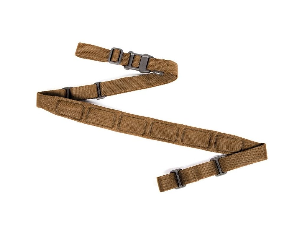 Popruh je vyroben z pevné nylonové tkaniny o šířce 3,2 cm (1,25") a vybaven polstrovanou nosnou částí pro vyšší komfort. MS1 Slider drží nastavení pevně, ale umožňuje okamžitou změnu délky. Konstrukce bez volných smyček minimalizuje zachytávání o výstroj. Barevné provedení COY (Coyote Brown) ladí s taktickou výstrojí v pískových/zemitých tónech.