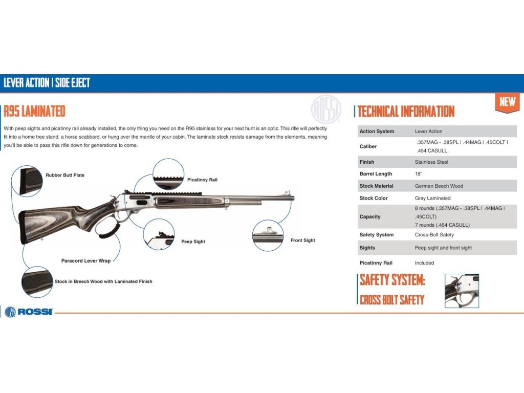 Značka Rossi je pevně zakořeněná v tradici výroby pákových pušek již od roku 1889. Brazilský výrobce dlouhodobě kombinuje historický design s moderními technologiemi a materiály. Série R95 přináší spolehlivost klasické konstrukce s novými prvky jako je boční vyhazování, závity pro montáže nebo nerezové varianty. Model Laminated je skvělým příkladem spojení stylu, trvanlivosti a funkčnosti pro moderního střelce.