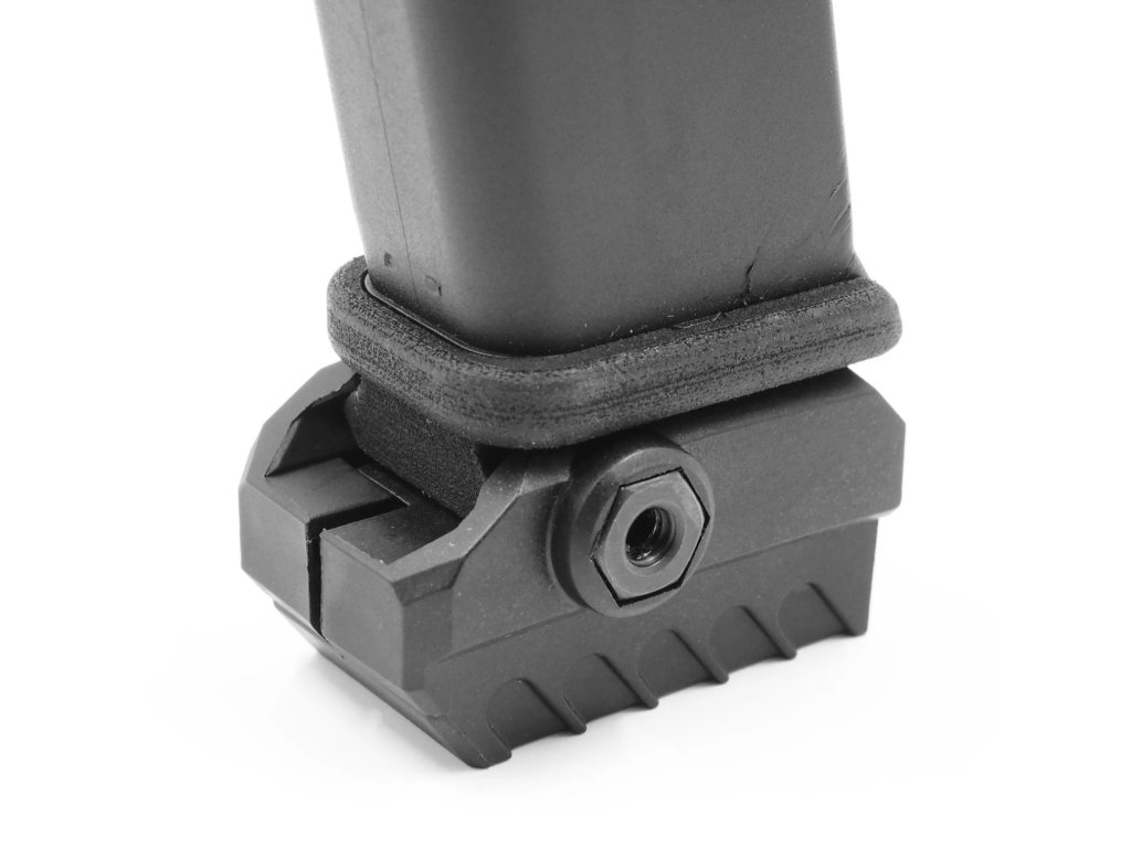 Tento adaptér je určen k instalaci na spodní část zásobníků pistolí Glock, které používají dvouřadé zásobníky, v rážích 9 mm a .40. Nahrazuje originální botku zásobníku a přidává lištu (rail) pro uchycení modulu MantisX. Instalace je jednoduchá a trvá méně než minutu, bez zásahu do rámu zbraně.