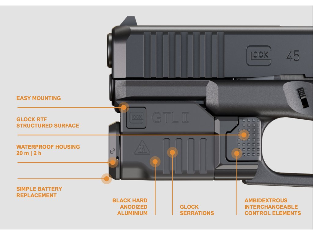 Značka Glock patří mezi nejvýznamnější výrobce služebních zbraní a příslušenství, známá využitím moderních polymérů, přesného obrábění oceli, lehkých a pevných hliníkových konstrukcí a propracovaných rail systémů. Výrobce dlouhodobě kombinuje spolehlivost, jednoduchost a extrémní odolnost. Příslušenství, jako je řada svítilen GTL, je navrženo tak, aby poskytovalo profesionálním uživatelům maximální funkčnost a plnou kompatibilitu se zbraněmi Glock.