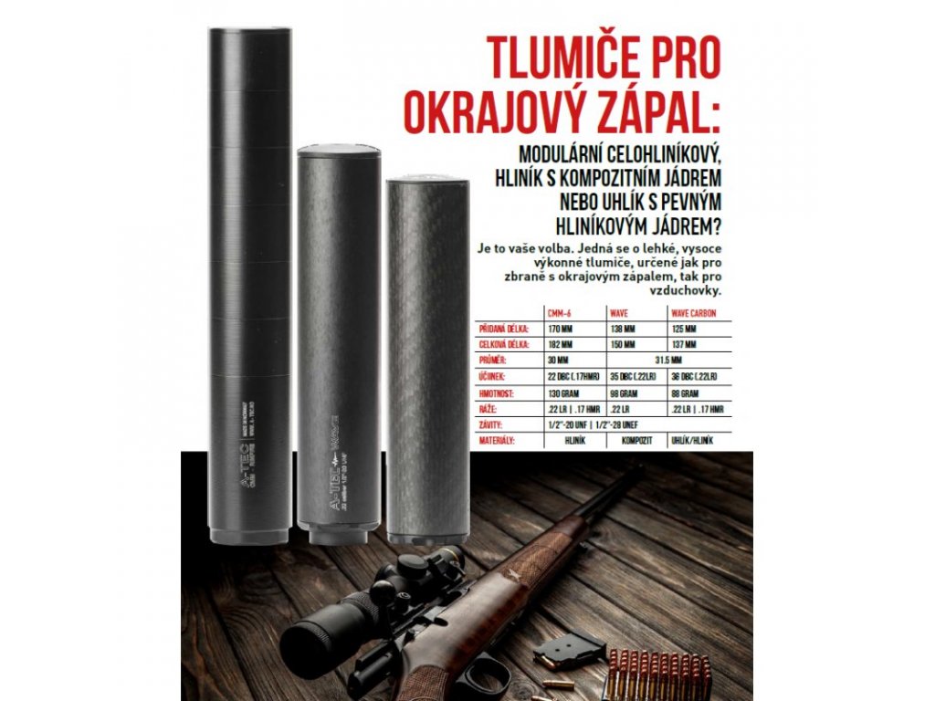 A-TEC tlumiče pro malorážky - kompletní popis technická data, seznam ráží a systémů upnutí v katalogu A-TEC v Českém jazyce ke stažení na našich stránkách. Tlumiče Wave a Wave Carbon jsou nerozebíratelné, kompozitní tlumiče, které nejsou ohroženy korozí/erozí a k jejich údržbě stačí pouze občasné namazání/prostříknutí závitu přípravkem WD40. Jejich účinnost je perfektní i po vystřelení více jak 20 000 výstřelů. Jsou určeny pro dlouhé, krátké, opakovací i samonabíjecí zbraně Tlumiče CMM-6 jsou rozebíratelné, modulární a jejich údržba je stejná jako u všech ostatních tlumičů