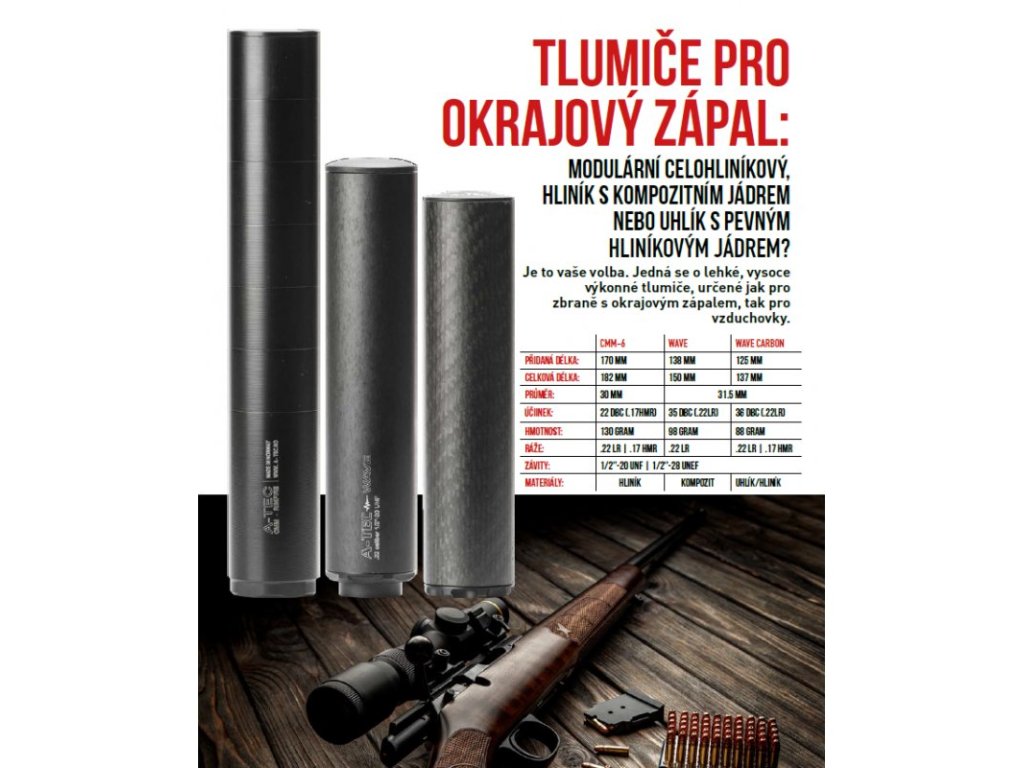 A-TEC tlumiče pro malorážky - kompletní popis technická data, seznam ráží a systémů upnutí v katalogu A-TEC v Českém jazyce ke stažení na našich stránkách. Tlumiče Wave a Wave Carbon jsou nerozebíratelné, kompozitní tlumiče, které nejsou ohroženy korozí/erozí a k jejich údržbě stačí pouze občasné namazání/prostříknutí závitu přípravkem WD40. Jejich účinnost je perfektní i po vystřelení více jak 20 000 výstřelů. Jsou určeny pro dlouhé, krátké, opakovací i samonabíjecí zbraně Tlumiče CMM-6 jsou rozebíratelné, modulární a jejich údržba je stejná jako u všech ostatních tlumičů