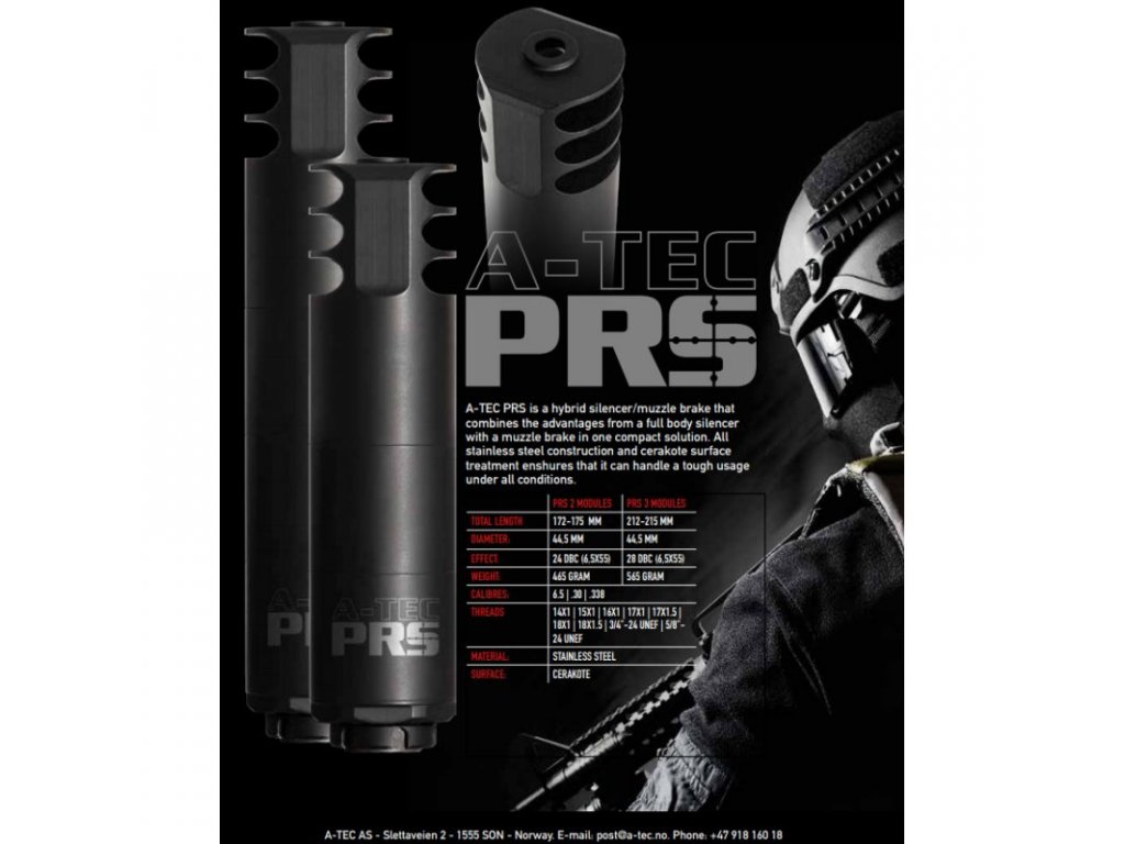A-TEC PRS 2 MOD nový Hybridní tlumič, pro sportovní, taktické, opakovací pušky na přesnou střelbu na dlouhé vzdálenosti (PRS), který kombinuje tlumič s úsťovou brzdou. Úsťová brzda navíc významně snižuje zpětný ráz zbraně.