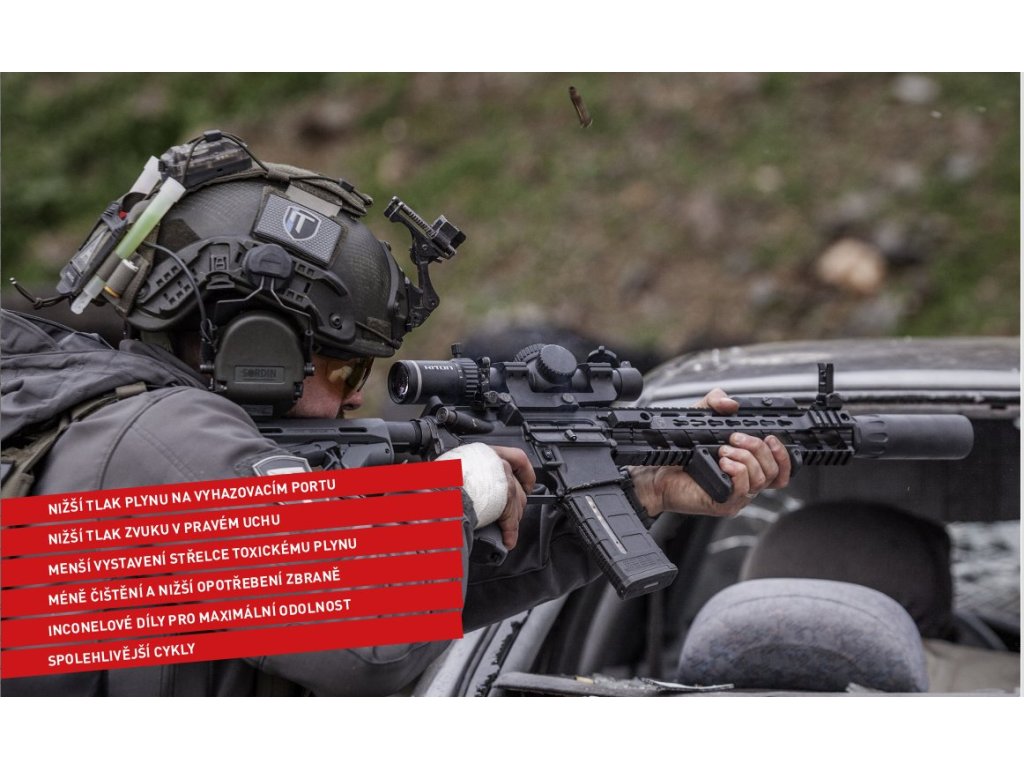A-TEC A-FLOW 1+3 je tlumič navržený pro řešení klíčového problému moderních poloautomatických a automatických zbraní — nadměrného zpětného tlaku. Patentovaná technologie A-FLOW odvádí plyn koaxiálně mimo vývrt, čímž zásadně snižuje tepelné i tlakové zatížení závěrového mechanismu. Výsledkem je nižší opotřebení, stabilnější chod a podstatně komfortnější střelba bez tlakových výtrysků u vyhazovacího okénka. Tlumič je ideální pro dynamickou střelbu, služební použití i intenzivní trénink.