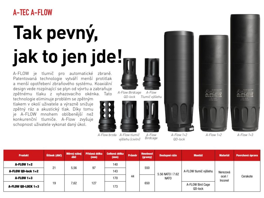Tlumič A-TEC A-FLOW 1+3 QD Lock je navržen pro maximální eliminaci zpětného tlaku, který běžně zatěžuje zbraňové systémy a ovlivňuje komfort střelce. Koaxiální vedení plynů směruje expanzi mimo vývrt a snižuje teplotní namáhání i znečištění systému. Konstrukce 1+3 modulů umožňuje vysoký tlumicí účinek při zachování příznivé hmotnosti. Montáž přes QD Lock na tlumiče výšlehu poskytuje maximální rychlost a jistotu při použití v dynamických situacích. Tlumič je vhodný pro automatické, poloautomatické a sportovní pušky v rážích do .223" / 5,56 mm.