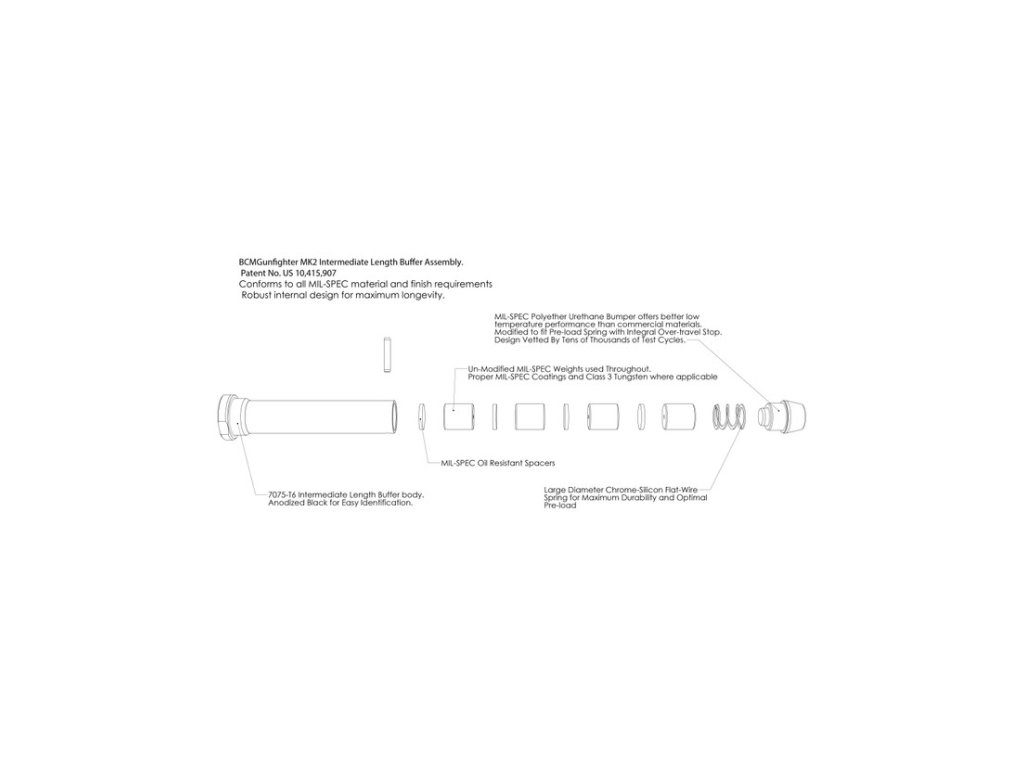Tlumič zpětného rázu MK2 Mod 1 využívá inovovanou konstrukci s prodlouženou střední délkou, která je navržena výhradně pro kombinaci s BCM MK2 Receiver Extension a puškovou vratnou pružinou M16A4. Tato konfigurace zajišťuje konzistentnější rychlost závěru a stabilní funkci celé zbraně, obzvlášť u moderních sestav AR15.