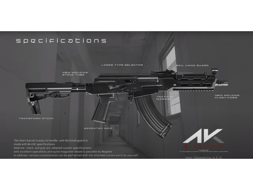 Tokyo Marui AK Storm je osazeno atypickým elektrickým mechaboxem NGRS s precizně laděnými díly pro spolehlivý chod a realistický zážitek ze střelby. Díky délce hlavně 300 mm dosahuje vysoké přesnosti, přičemž kompatibilita s 7,4V Li-Pol zajišťuje snadný provoz. Ergonomie zbraně je vyladěna do detailu: od nízkoprofilové pažby, přes rozšířený magwell, až po RIS lištu pro montáž příslušenství. Tlačný zásobník na 90 BBs eliminuje problémy s podáváním a přispívá k vyšší spolehlivosti v akci.
