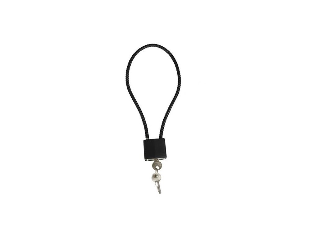 Konstrukce zámku kombinuje flexibilní ocelové lanko odolné vůči přetržení s kompaktním zámkovým tělem, což zvyšuje univerzálnost upevnění. Ocelové lanko umožňuje snadné provlékání a upevnění i přes větší úchyty. Mechanismus na klíč minimalizuje riziko náhodného otevření a zvyšuje bezpečnost v porovnání s jednoduchými kombinacemi. Povrchová úprava v černém odstínu snižuje korozi a zajišťuje nenápadný vzhled vhodný pro taktické i civilní použití.
