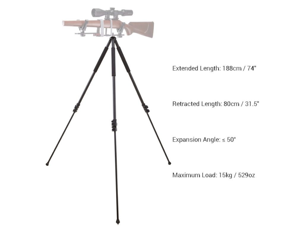 Lze nastavit na výšku od 80 cm až 188 cm, přičemž váží pouhý 1 kg. Je vybavena měkkou podpěrou z EVA pěny, což zajišťuje pohodlné a bezpečné držení. Díky kuličkovému ložisku v konektoru je možné trojnožku zatížit puškou o váze až 15 kg.