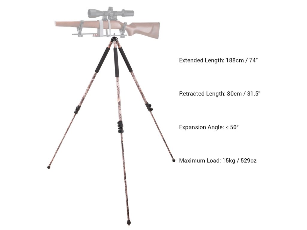 Lze nastavit na výšku od 80 cm až 188 cm, přičemž váží pouhý 1 kg. Je vybavena měkkou podpěrou z EVA pěny, což zajišťuje pohodlné a bezpečné držení. Díky kuličkovému ložisku v konektoru je možné trojnožku zatížit puškou o váze až 15 kg.
