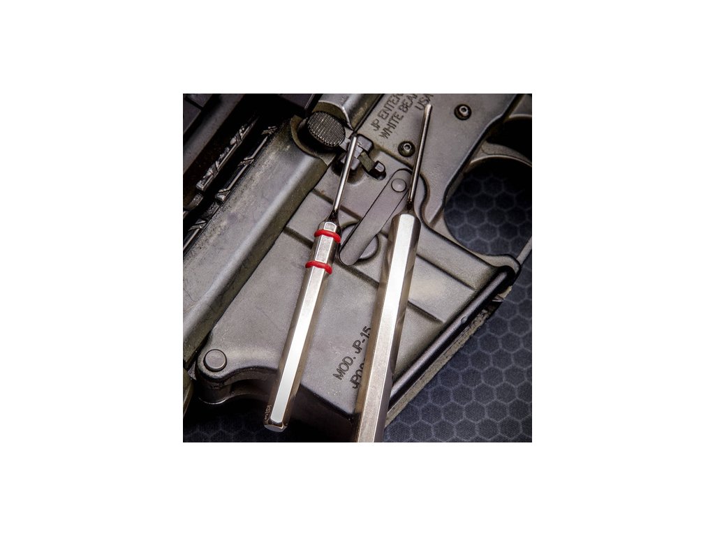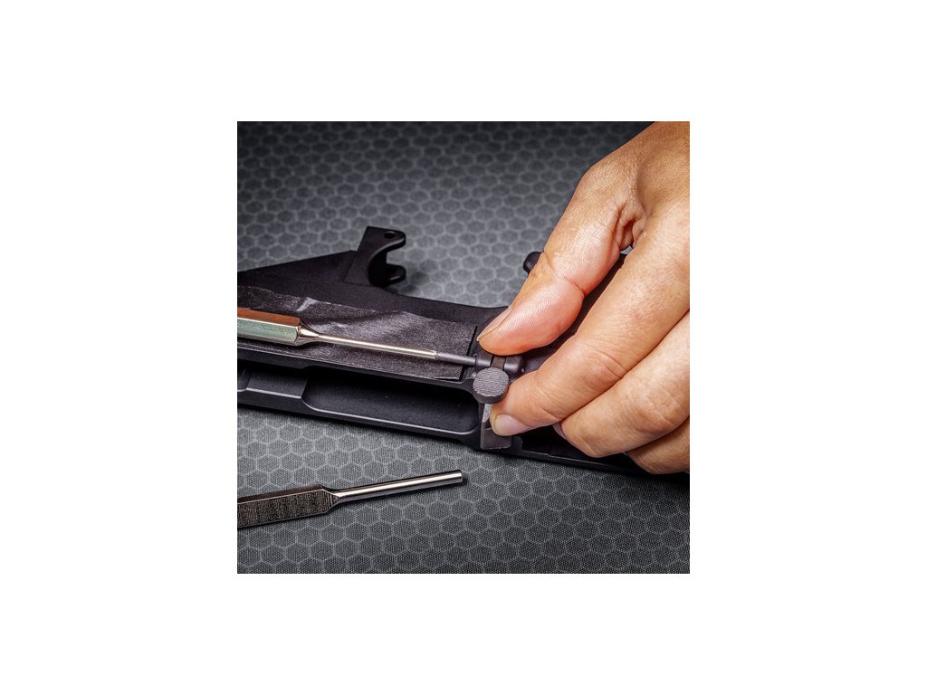 Tato dvoudílná sada obsahuje magnetický zavaděč a vyražeč čepu, které byly navrženy speciálně pro snadnou a bezpečnou práci s čepem záchytu závěru na platformě AR-15. Díky ploché straně, která se přikládá přímo k tělu zbraně, nehrozí žádné poškození povrchu loweru. Magnetická část zavaděče umožňuje pohodlné uchopení a vedení čepu bez rizika jeho ztráty či nechtěného poškrábání zbraně. Vyražeč má optimální délku a průměr 5/32", což zaručuje přesnost a efektivitu při každém použití. Ideální doplněk pro každého, kdo se věnuje stavbě, údržbě nebo úpravám AR-15.