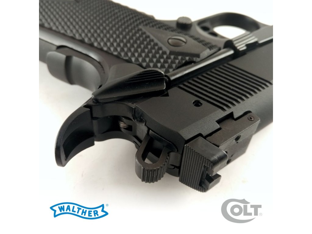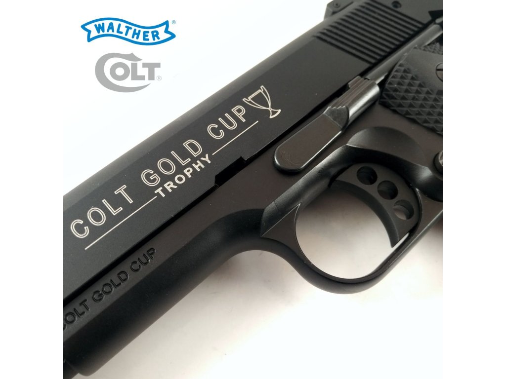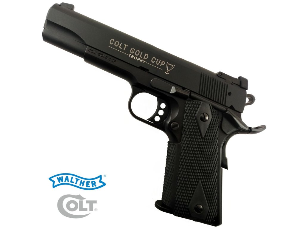 Walther - Colt 1911 Gold Cup je vyladěné soutěžní provedení základního modelu 1911-A1 (Government). Zbraň je osazena zvětšeným bobřím ocasem a hmatníkem pojistky, stavitelnými mířidly, pryžovými střenkami, prodlouženým záchytem zásobníku a dalšími vychytávkami.