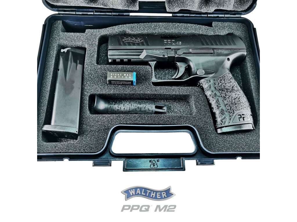 Obsah balení: zbraň, plastový kufřík, 2x zásobník (12r), výměnný hřbet vel.L, tlačítko vypouštění zásobníku - pravé, návod CZ/EN