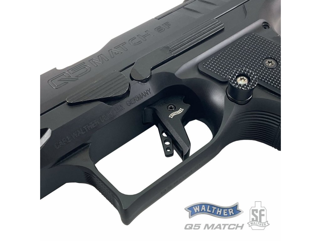 Pistole Walther Q5 Match SF Black Ribbon je osazena špičkovou spouští Dynamic Performance. Tato spoušť má jazýček a pojistku vyrobeny z vysoce kvalitní slitiny hliníku, přičemž jazýček má plochý tvar. Propad i reset spouště jsou již z výroby nastaveny tak, aby spoušť měla naprosto bezkonkurenční charakteristiku při zachování vysoké pasivní bezpečnosti.