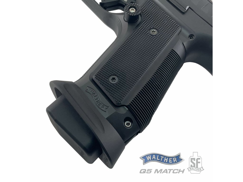 Zbraň je dále osazena speciálními super tenkými hliníkovými střenkami, jež ještě více vylepšují již tak špičkovou ergonomii modelu Q5 Match SF a zvětšeným náběhem do zásobníkové šachty. Pistole se dodává se třemi zásobníky opatřenými hliníkovou botkou zvyšující kapacitu o dva náboje.