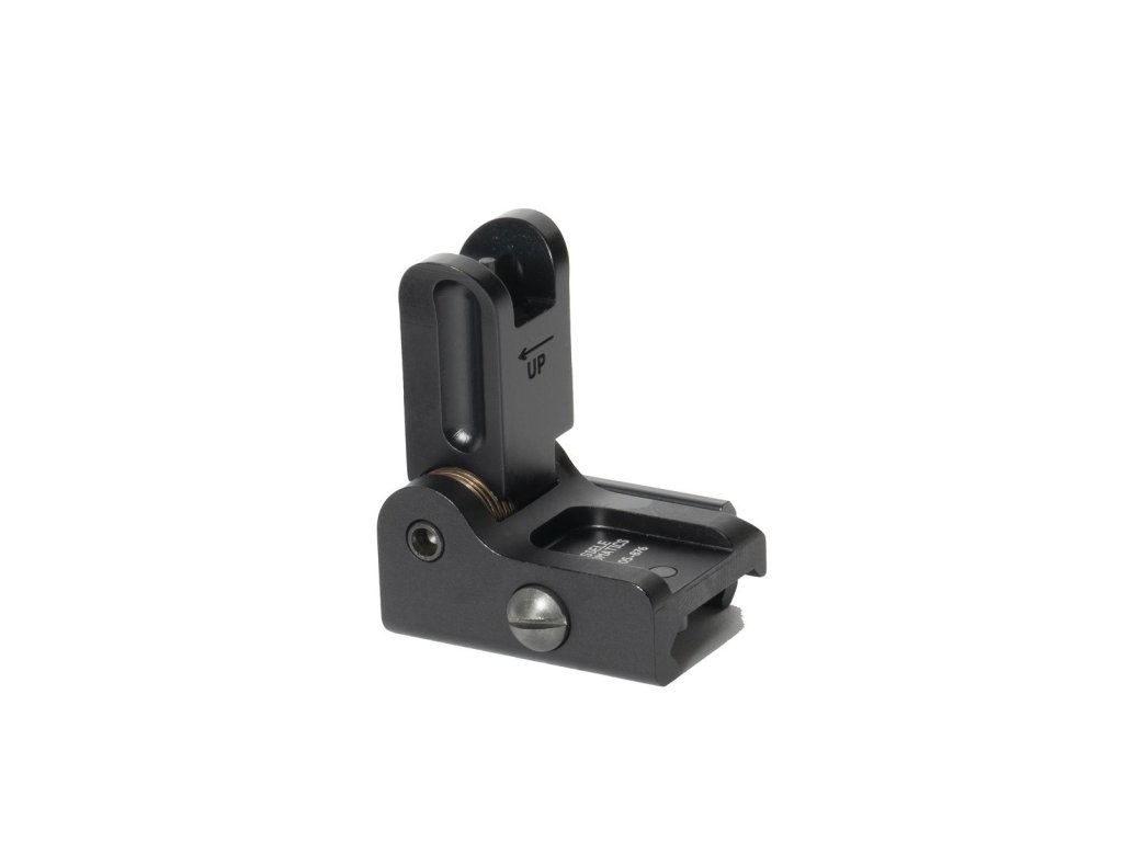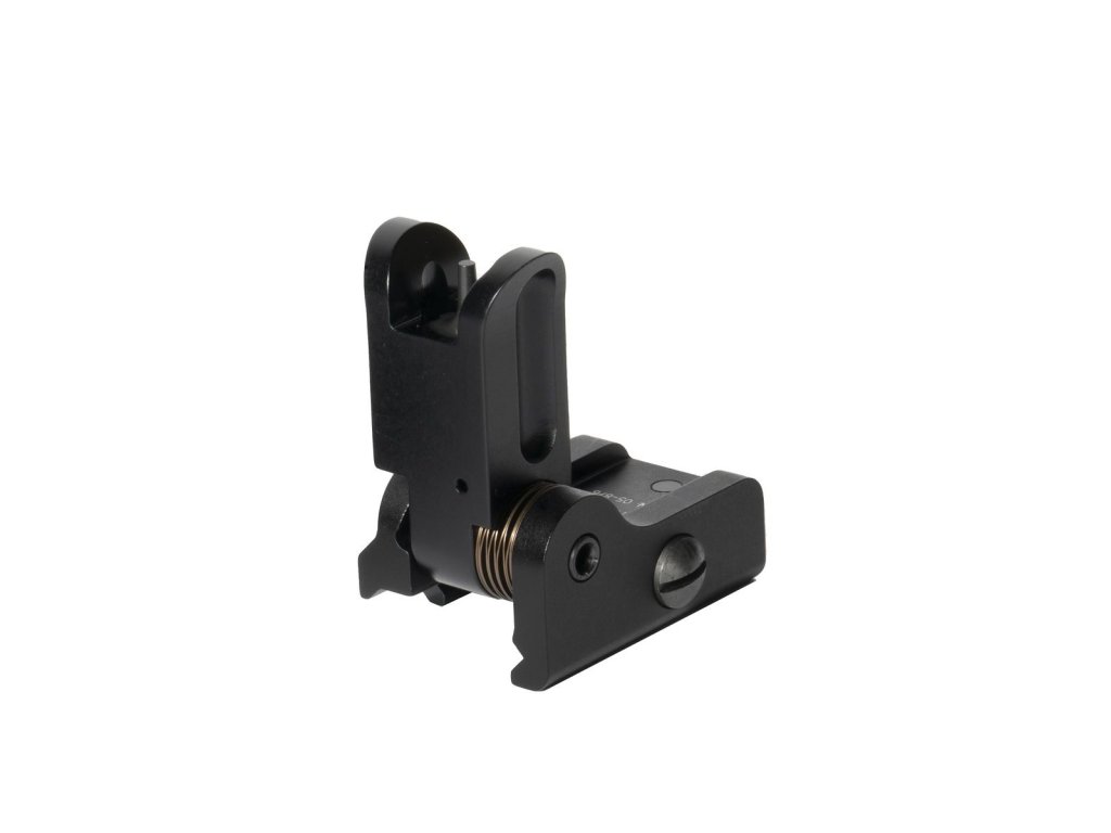 Při rozložení poskytuje výšku 37,3 mm od montáže a při složení jen 12,4 mm, díky čemuž nepřekáží ani při použití optiky. Jemná regulace 0,5 MOA na klik umožňuje přesné doladění výšky střelby. Šířka mušky 2 mm poskytuje ideální rovnováhu mezi rychlostí a přesností zamíření.